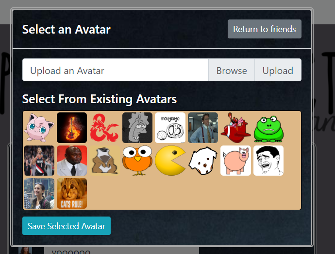 The avatars component allows users to upload and select avatars for display with their usernames. Avatars are stored using firebase storage, and new avatar images may be uploaded to the storage database by users. This is done using the javascript file interface and a put request. Because the firebase storage system does not allow for getting download links for files programatically, each avatar has a filepath reference object created in the main database. This reference is then used to access the actual link URL using firebase's getURL function. The avatar list that users may select from is built by using an array of promises with each index getting a seperate download URL and resolved through a Promise.all.