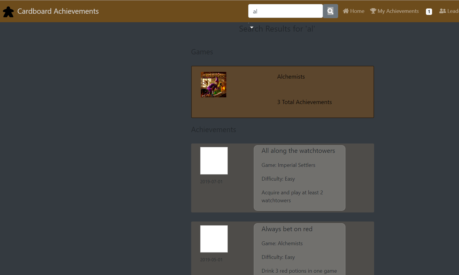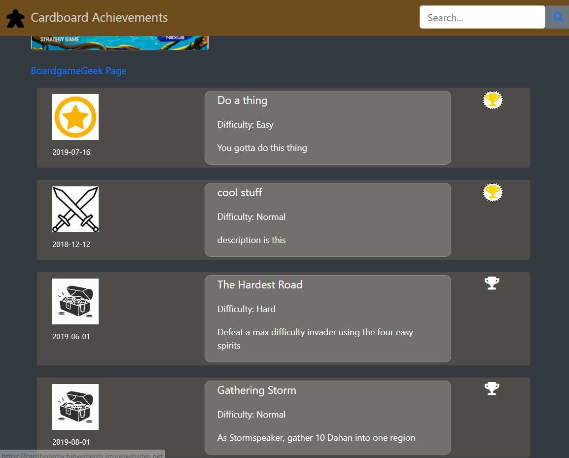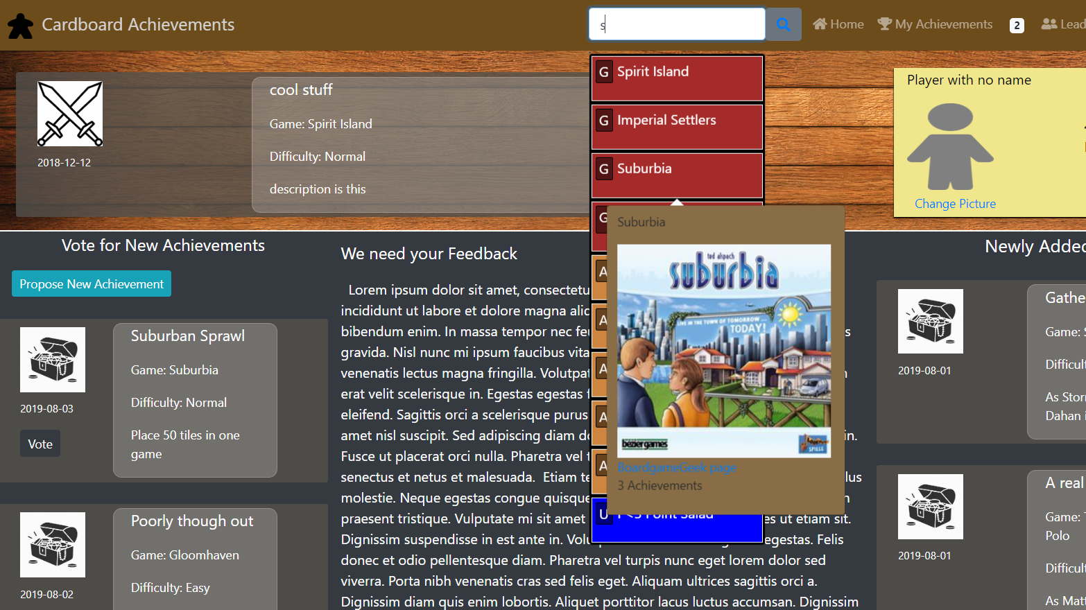 Cardboard achievements uses a custom self-made search functionality that searches items within each word for better search results. Furthermore, top results are displayed in a popdown selection with tags and styling based on item type. Users can hover over a search result for 2 seconds and a call is made to the database to retrieve and render a preview of that item.