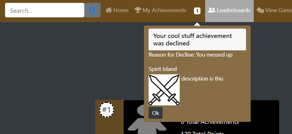 When a user's achievement submission is reviewed by a moderator, a notification is automatically generated for the user with the status of their achievement submitall and a reason for denial in the case that an achievement is not approved. After a user views a notification, it is flagged as viewed in the database and will no longer be returned or displayed to the user.