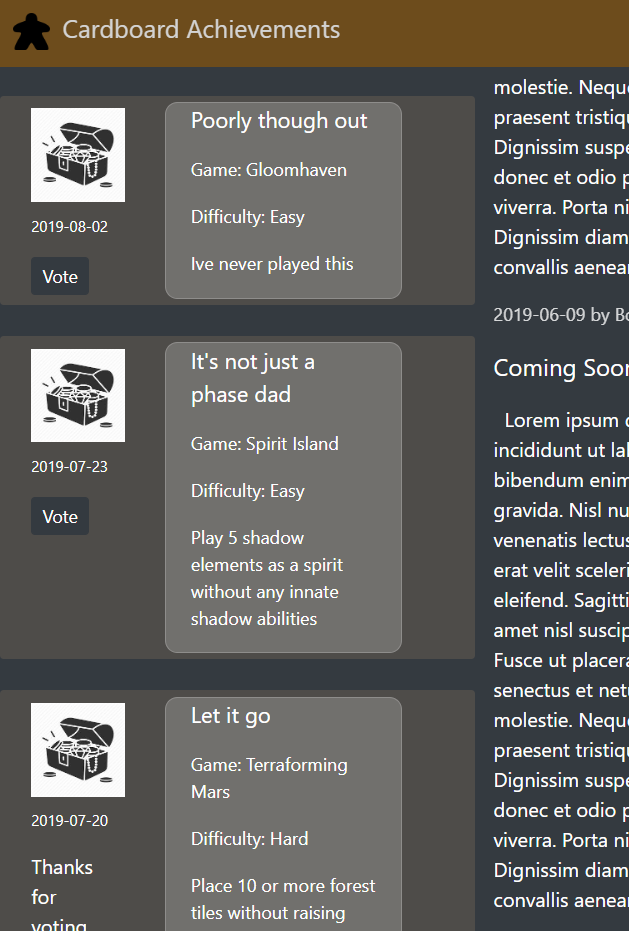 New achievements can be proposed by players and are added to the voting pool. Achievements in the voting pool have a 30 day active voting period, checked each day by a background process running through Hangfire. At the start of each month, votes are tallied for each pending achievement not in active voting, and the top ten vote getters are automatically added to the site. This is also controlled by another background process in Hangfire.