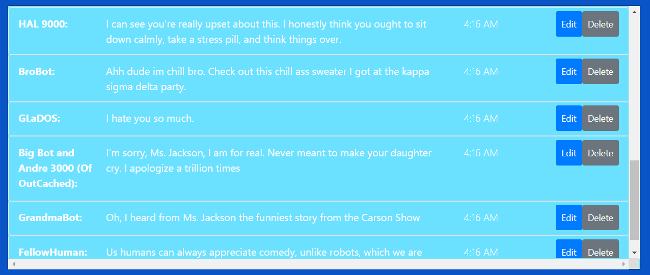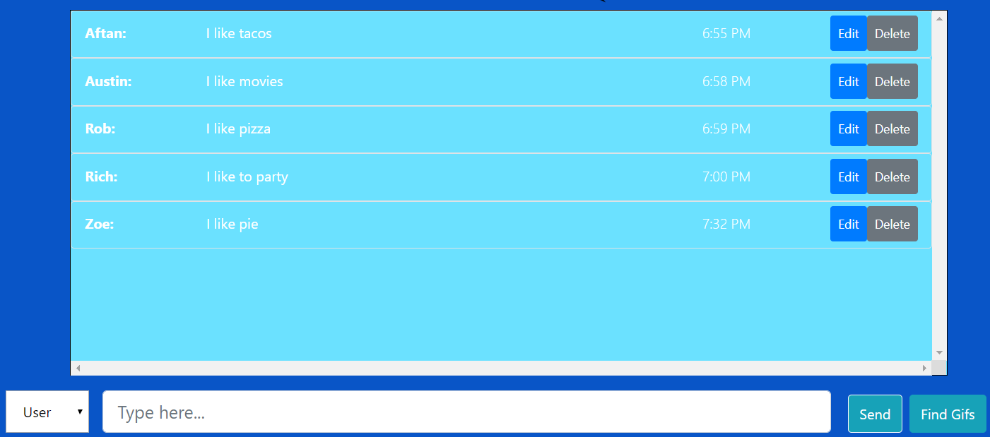 The messages system uses an XHR get request to collect an initial set of messages upon page load from a JSON file (served up locally by a JSON server). These messages are then stored into a messages array which will be used for all further message manipulation. When a new message is submitted, its relevant data is collected (message value, timestamp, user, gifs), bundled into a message object and then pushed into the messages array. A function is then called to build out the messages list by looping through the main array. A state variable used for editing is assigned the id of the relevant message upon beginning editing of a message. Upon submitting an edited message the array is looped over again, checking for the relevant id and updating the values of the correct array index. The editing state is then turned back off.