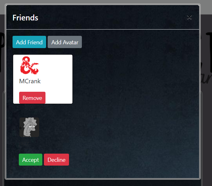 The friends component primarily makes use of a firebase database of users and friend requests. Each user has a user key within the database including their google UID, their username, and their list of friends(by UID), and their avatar. The friends component uses a series of promises and axios calls to get the user objects for each friend from the current users friend list, and then build out a list of friends usernames and avatars to display to the user. The add friends page again uses a series of promises and axios calls to the database to get a list of users, and then do a series of filters on users who are already friends, have pending requests, or are the current user. Pending friend requests are stored in the database in the requests database, created by an axios post with the UIDs of both parties. When a request is accepted or declined, two series of axios calls are made to delete the request, and then add the approriate user to each party's friends list through an axios put request. The page is refreshed after each action.