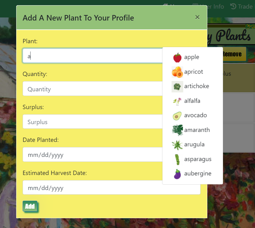 To insure consitentcy in search filtering and trading requests, plants added to a user's inventory must conform to a set listing of names. To help user's select the correct plant listing, plant entry uses a self-made auto-suggest feature to create a matching list of plant names, each with a visual icon for that plant type. Selecting from this auto-suggest list will then fill the relevant input.