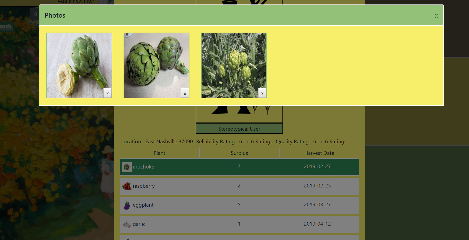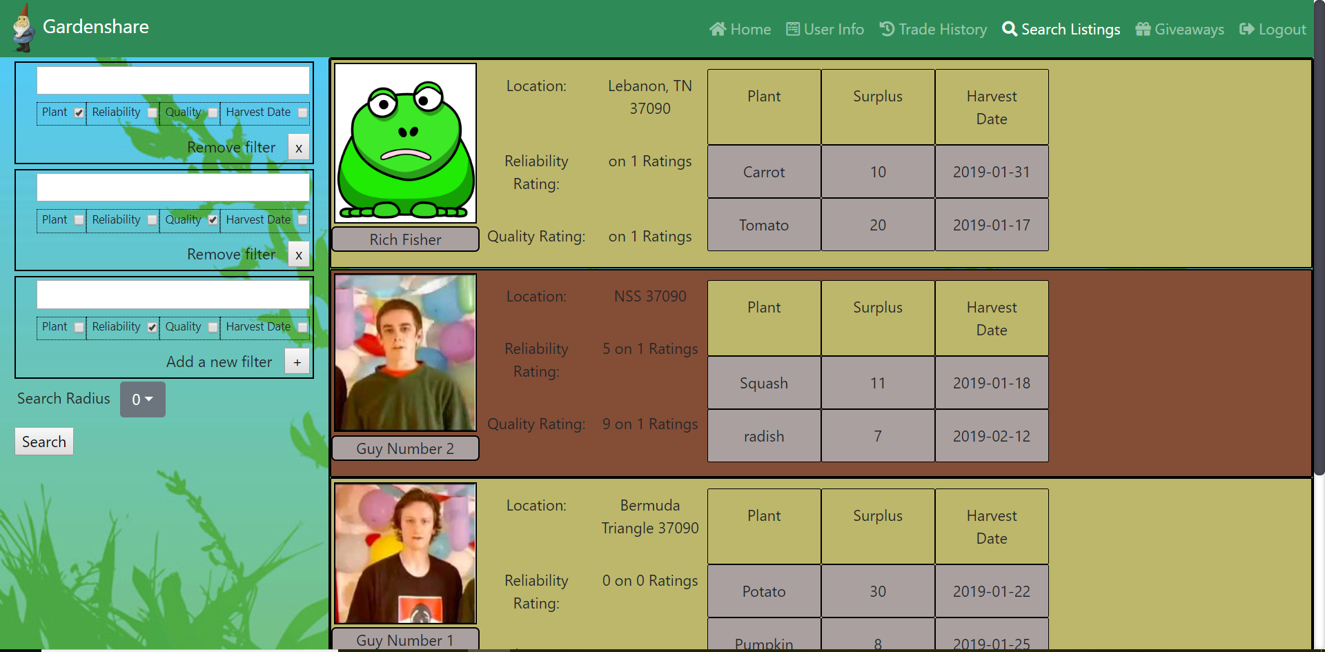 Gardenshare's user search utilizes zipcodeAPI to filter results in a chosen radius around the user. Additionaly, filters are available for ratings, name, and harvest dates. Users can choose as many filters as they want, and can even add multiple filters for the same channel. The filter component passes a reference to itself up to the main component when options are selected, adding or removing filter objects from an array held in state to be iterated over by the filtering function.