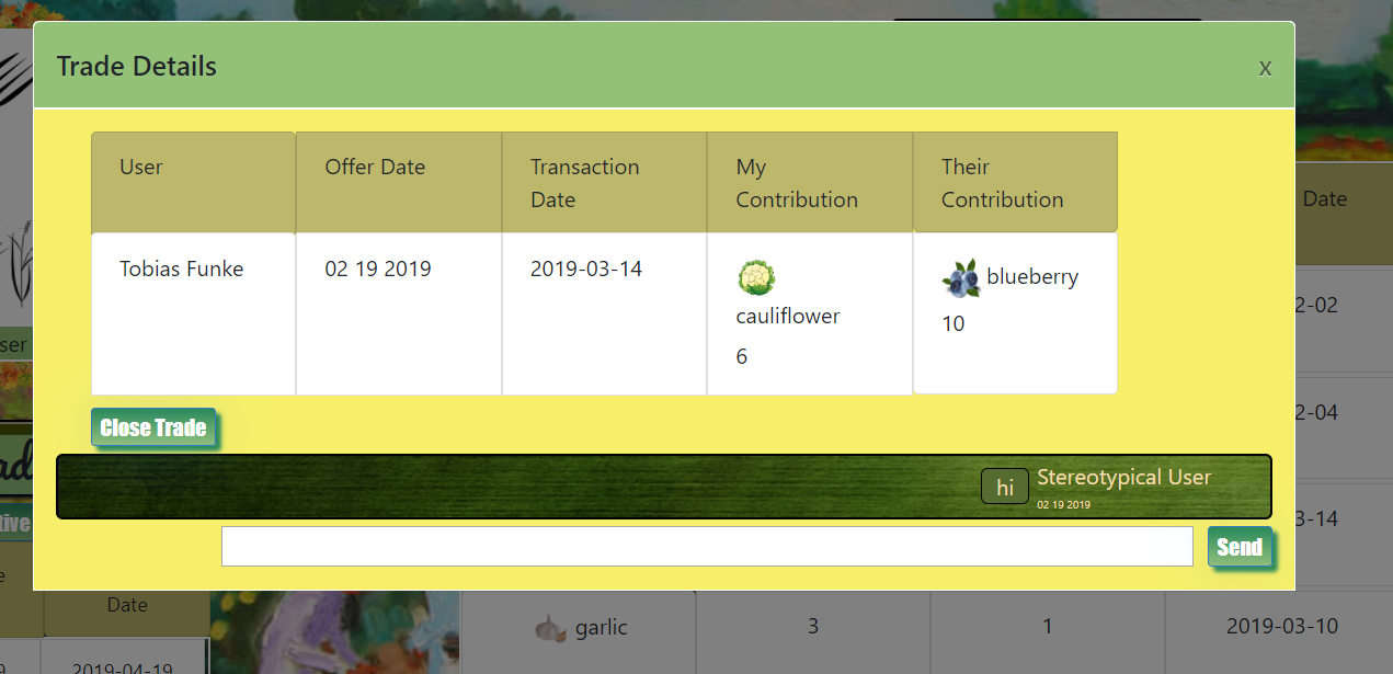 The trade system allows users to suggest crop trades with other users. The system prevents users from suggesting trades for products that they or the trade partner lack or have insufficient quantity. A built in messaging system is tied to each trade request, allowing for communication between the users as they work out the particulars of the trade. When a trade is completed, each user's inventory is automatically updated to reflect the trade changes. When closing a trade, each user has an opportunity to rate the product quality and reliability of their trade partner. This uses a self-made star-rating selector and display. The users ratings are aggregated and re-averaged after each rating.