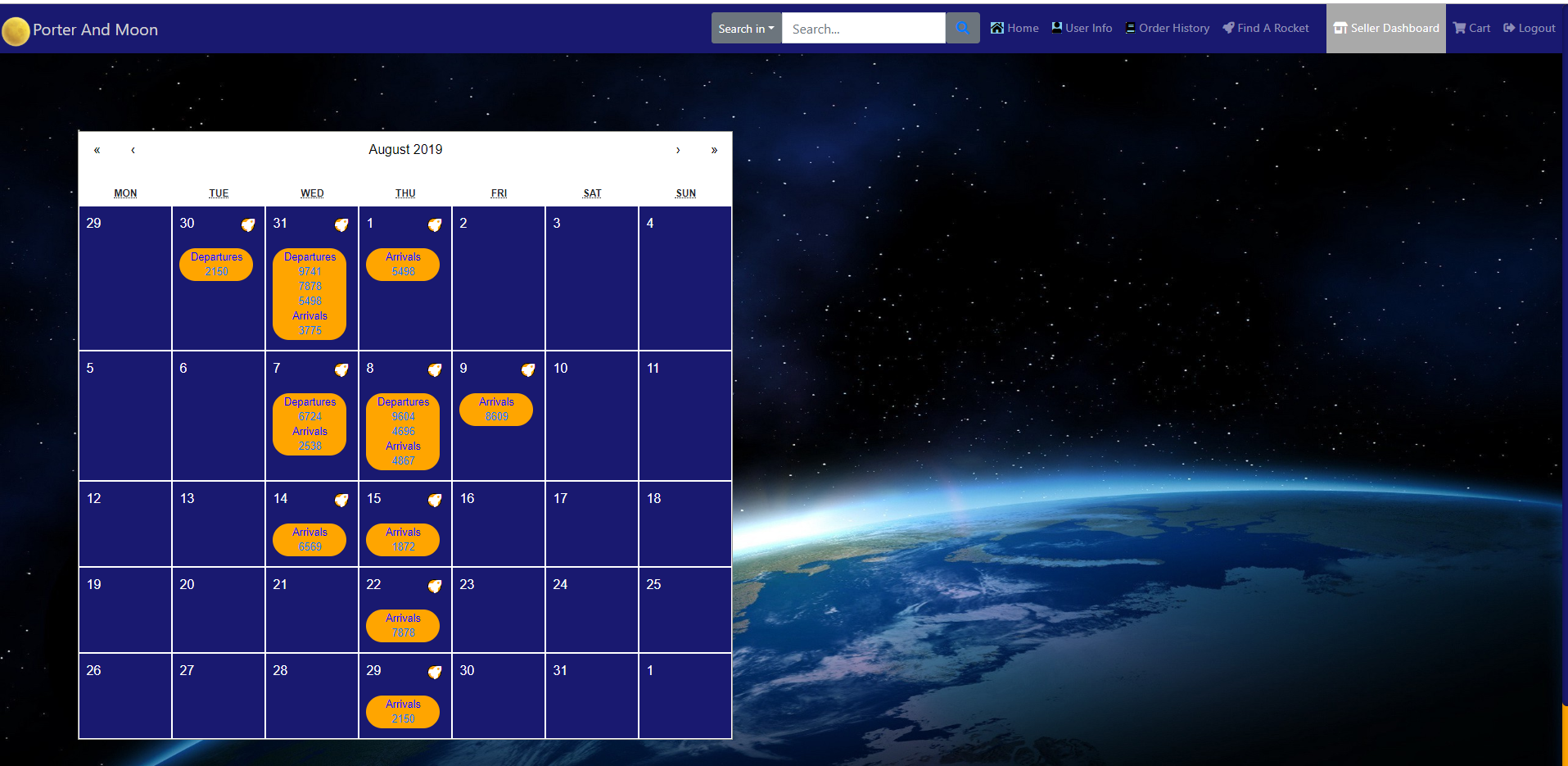 The flight calendar utilizes the React Calendar library to allow a seller to view their flight schedule. Flights are pulled from the sql server and have their arrival and departure times converted to the React Calendar format, where they are inserted into their proper dates along with a link to the flight details through a callback function passed to each date.