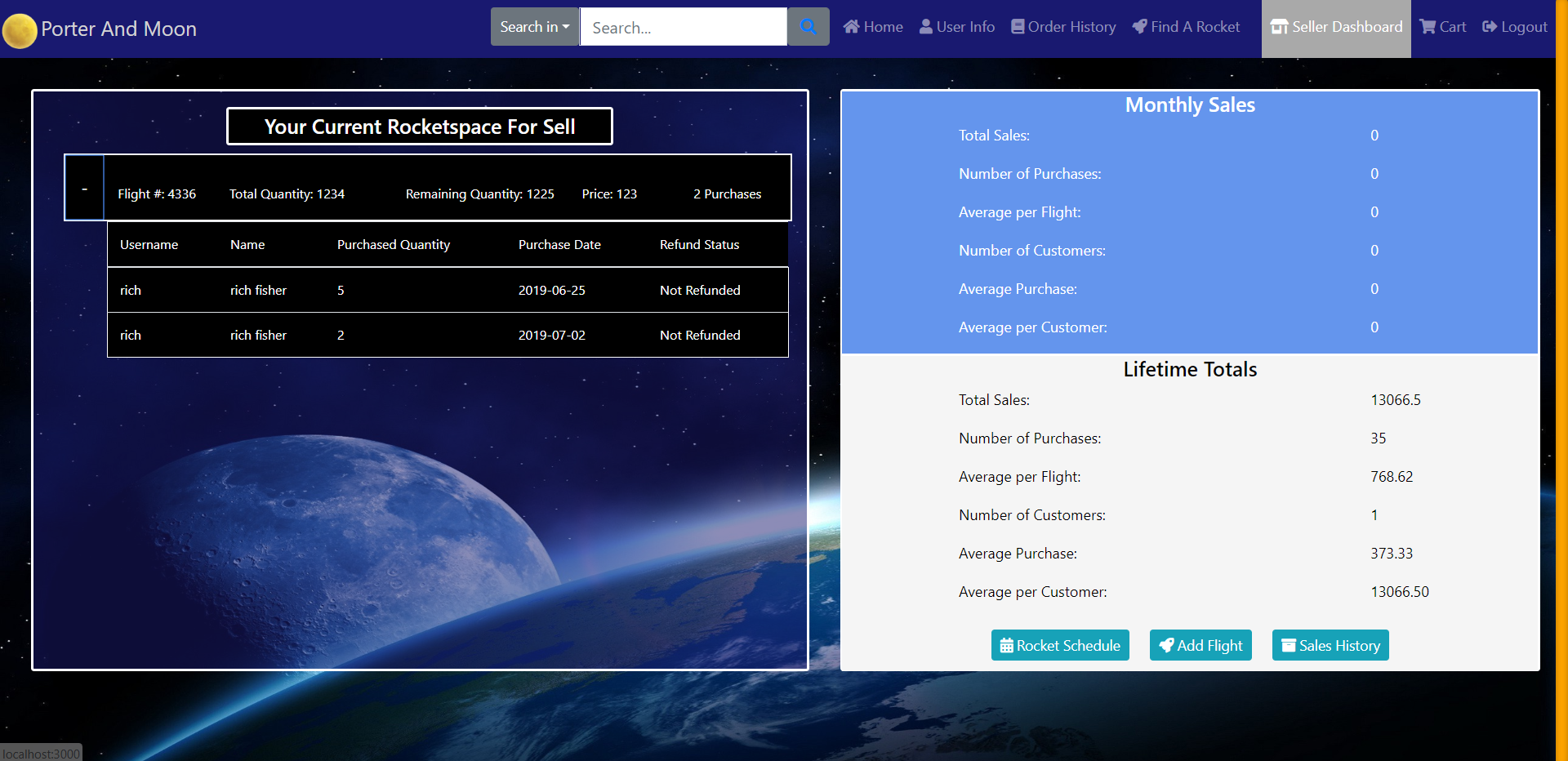 The seller dashboard pulls in the sellers flight tables from the sql server and joins each purchase to the relevant flight and each payment to the relevant order. The seller can then view not only general statistics and purchase information, but select individual purchases to view the order and payment details of that purchase.