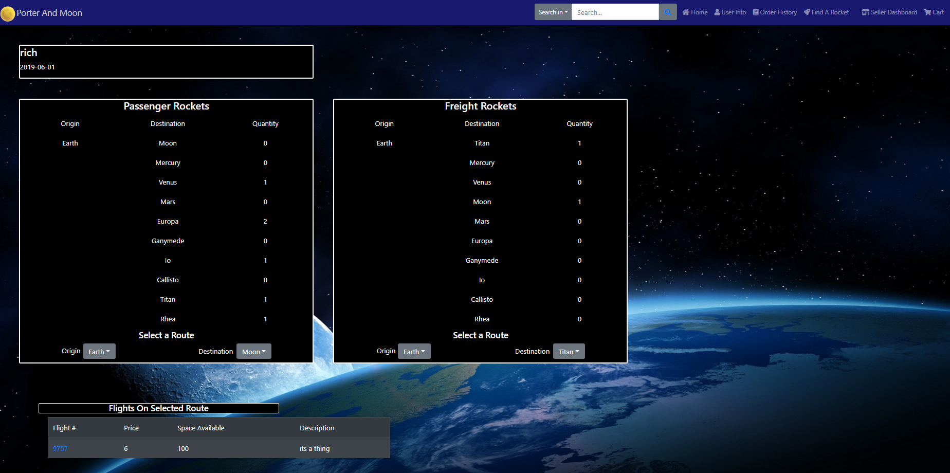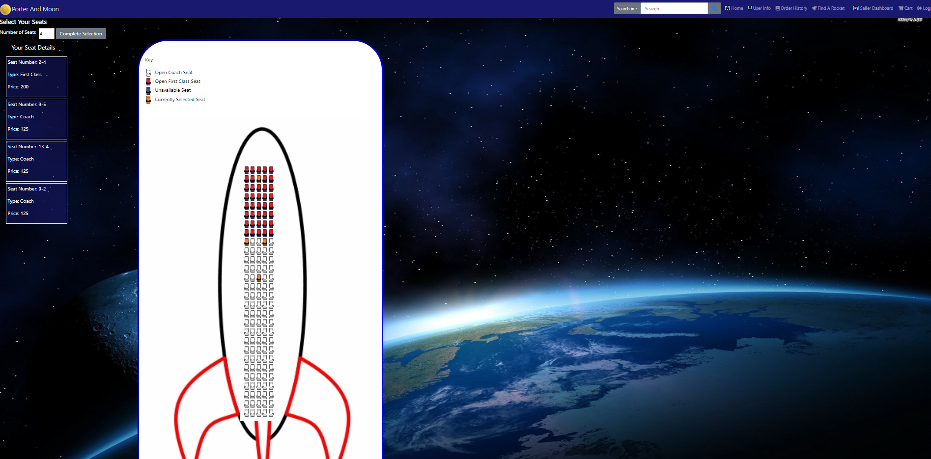 Each passenger flight added has a corresponding set of seats added to the sql database, generated through a cartesian join. The application then pulls these seats in when customers are purchasing to generate a visual map of the seats including which are are already purchased, which are first class, etc. using the data from the seats table along with the row length information stored with the flight. The site then uses the number of rows and row lenght to scale the rocket image size to fit the particulars of the flight.